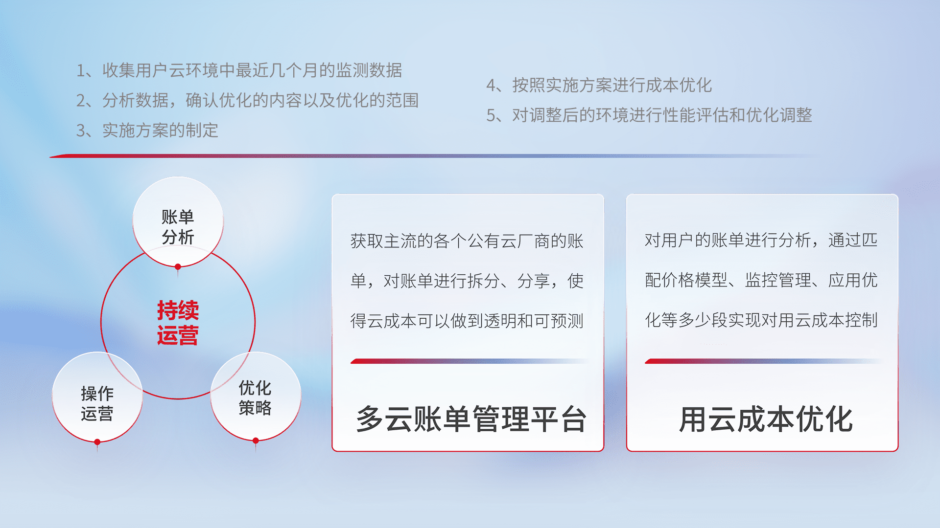 通过灵活运用多种自动化迁移工具,,,,帮助企业用户实现业务和数据高效 、、稳定的上云迁移和云上迁移,,,采用自研多云纳管平台,,,,以中立管理模式,,,解决多组织、、、多云、、、、多运维厂商的复杂关系的管理,,,保证多云平台资源配置的一致性,,,,实时掌控云资源运行数据,,运用智能化工具分析云资源多云平台的管理服务,,,透明化管理成本支出,,,用云成本可预测、、、用云费用可优化、、云资源配额有据可依。。。