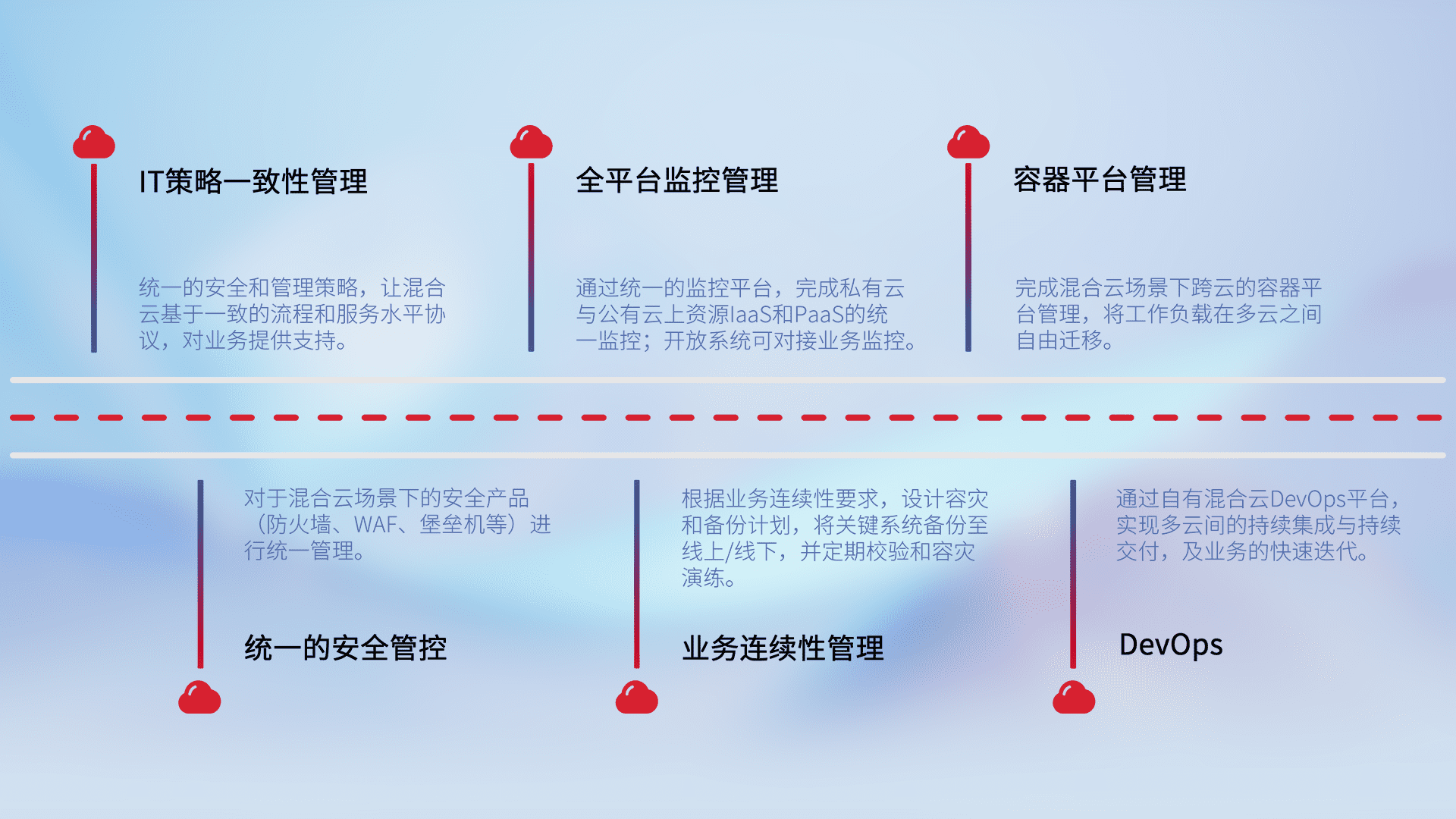 通过多云纳管,,,,以统一的资源数据模型把客户的云资源进行抽象和封装,,进而实现对多云资源的统一操作,,保障云资源管理的可靠性、、、、稳定性与可用性。。。。量身定制化运维内容,,,配置、、、开发运维、、、补丁管理、、、备份、、、监控、、认证和访问管理、、、审计和日常巡检等,,,保障在用云过程中的可靠度,,稳定度以及高可用率。。。