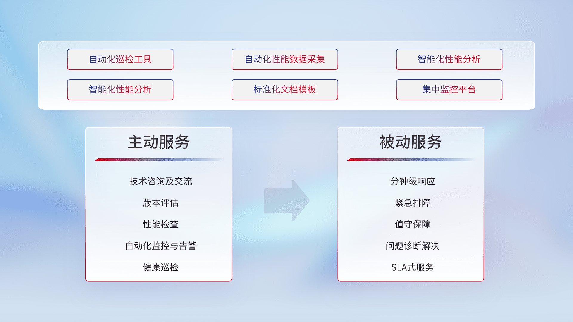 智能化工具和标准化文档,,,,保障服务质量,,,,提供主动服务(包含技术咨询、、、版本评估、、性能检查、、自动化监控与告警、、健康巡检)和被动服务包含(分钟级响应、、紧急排障、、值守保障、、问题诊断解决、、、、SLA服务)。。。